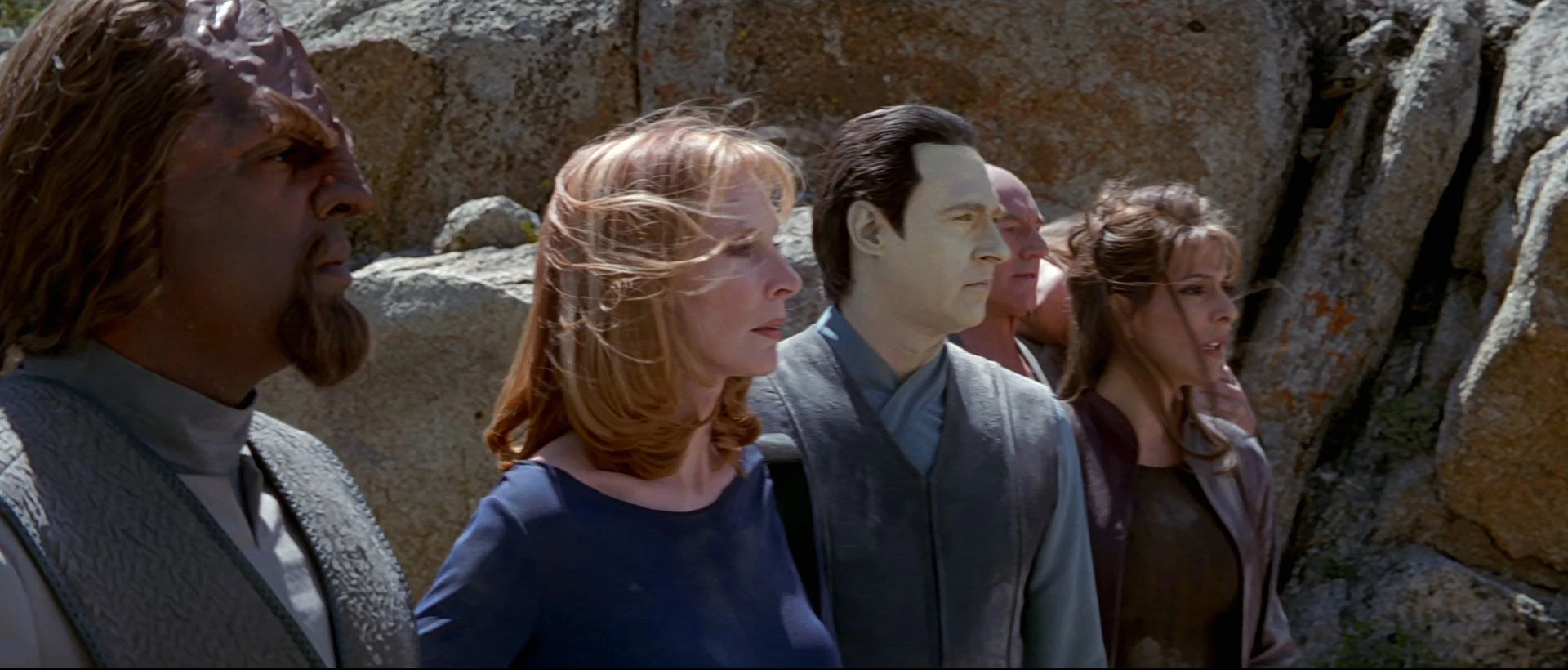 Worf catches up with Anij and Picard at the head of the group, the Klingon's hair has grown long and unruly; a symptom Worf says of Jak'tahla, Klingon puberty. "Any severe mood swings, unusual aggressive tendencies – be sure to let me know," Picard says, heeding Worf's warning that the Ba'ku have become tired. According to the geoscan, this is the safest area for the next few kilometers. The captain orders an hour of rest to break out the rations.