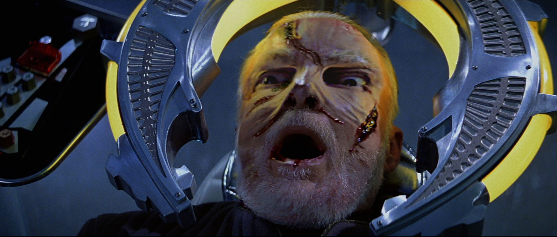 Admiral Dougherty and Ru'afo enter the captain's ready room, demanding the release of the Son'a officers and the departure of the Enterprise. Picard is ready for them, telling them that he found the holoship. Dougherty knows that he has been caught and asks Ru'afo to wait outside. The Son'a, however, refuses and shouts an enraged "NO!!!" The skin stretched tight over Ru'afo's forehead breaks and blood drips down his face. "This entire mission has been one Federation blunder after another," he snarls. "You will return my men or this alliance will end with the destruction of your ship." Ru'afo storms out, leaving Dougherty and Picard alone.