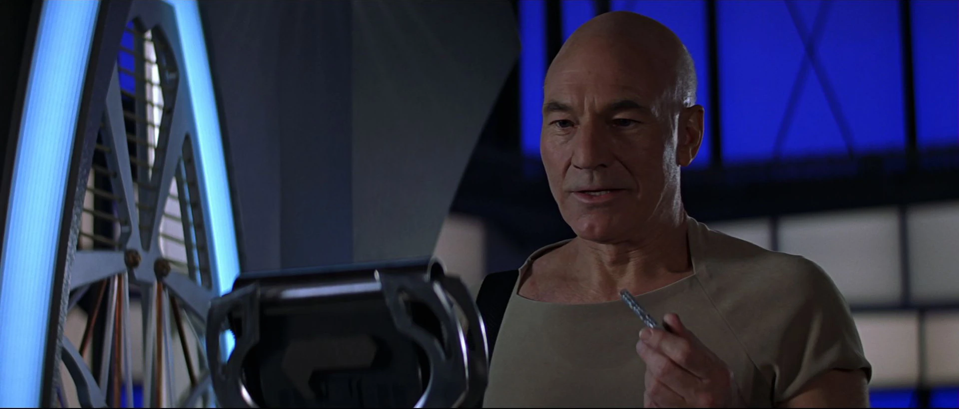 Picard goes to his quarters. With a view of the Ba'ku planet below, he slowly removes each of his rank pips and renounces his status as a Starfleet captain.