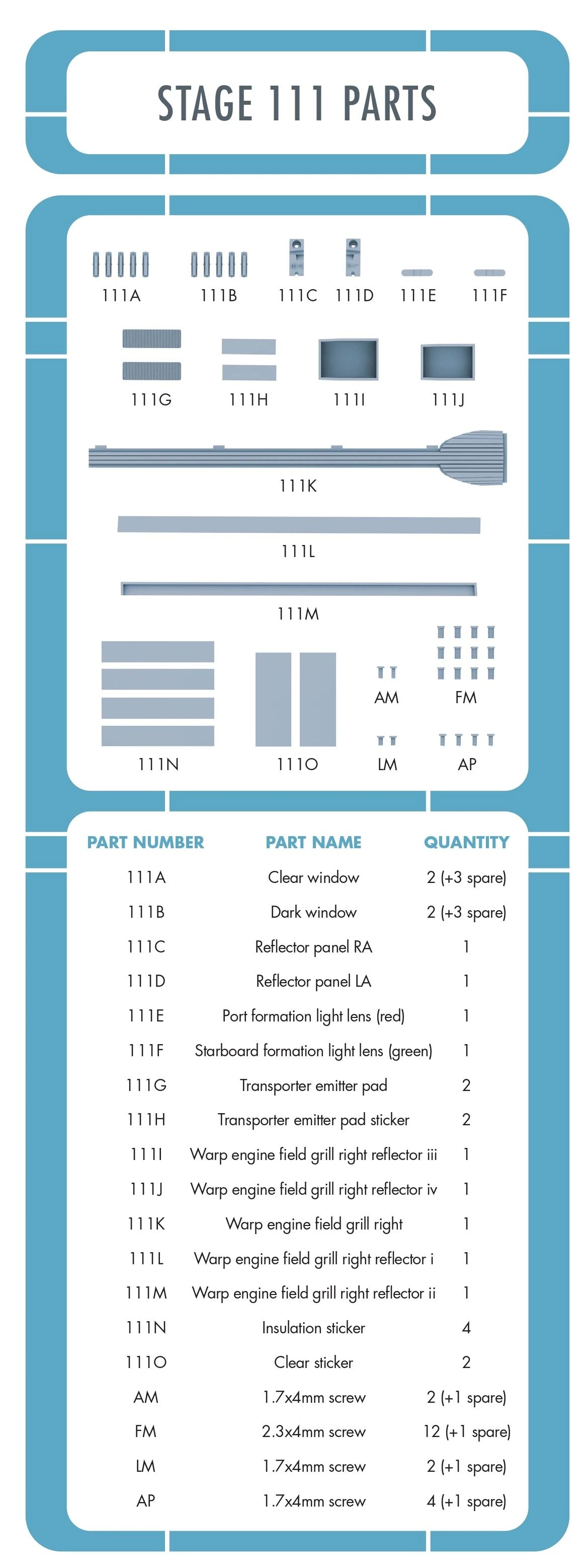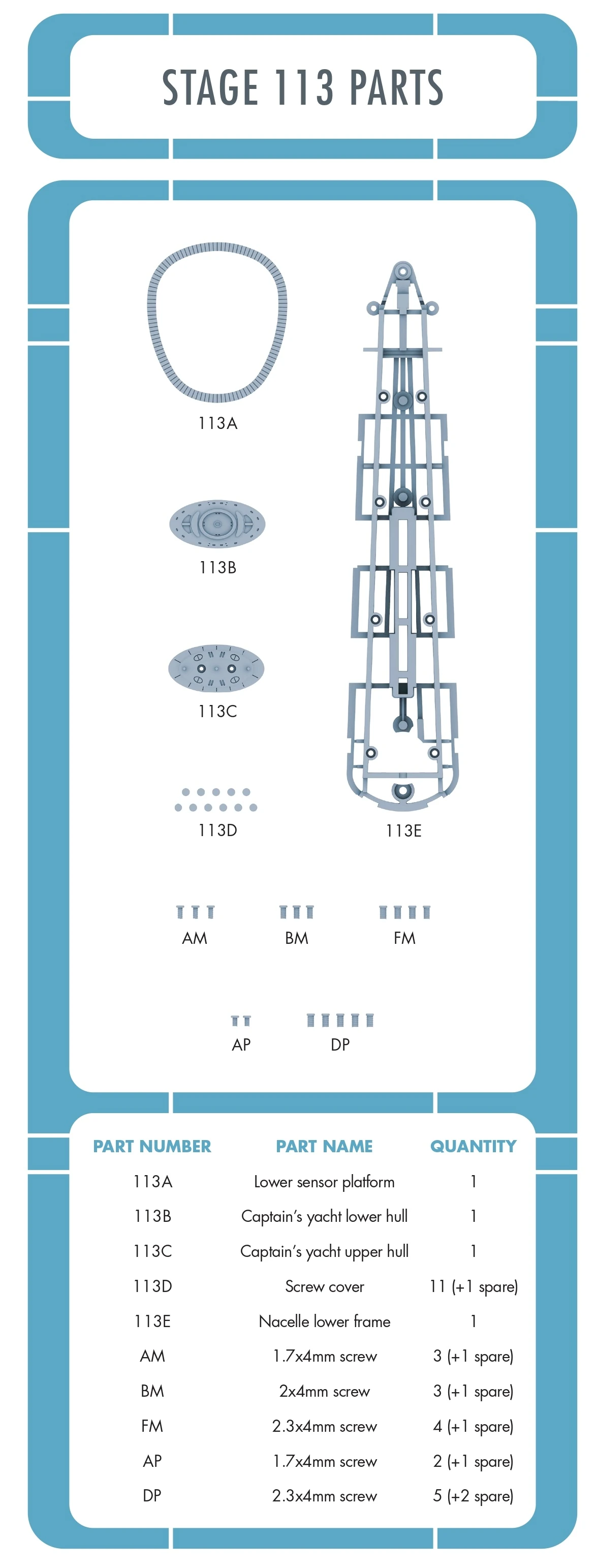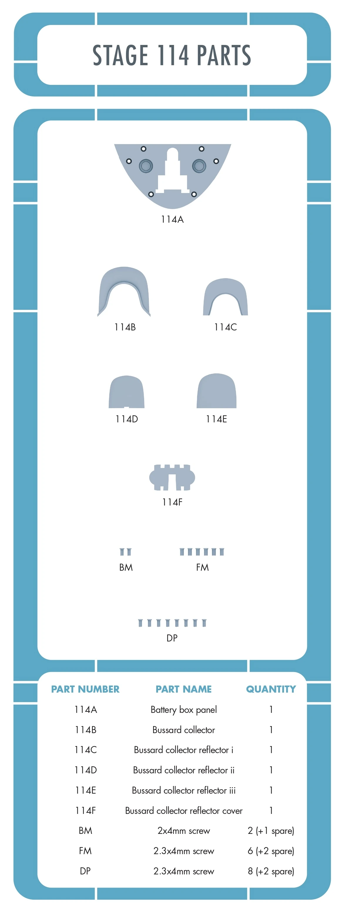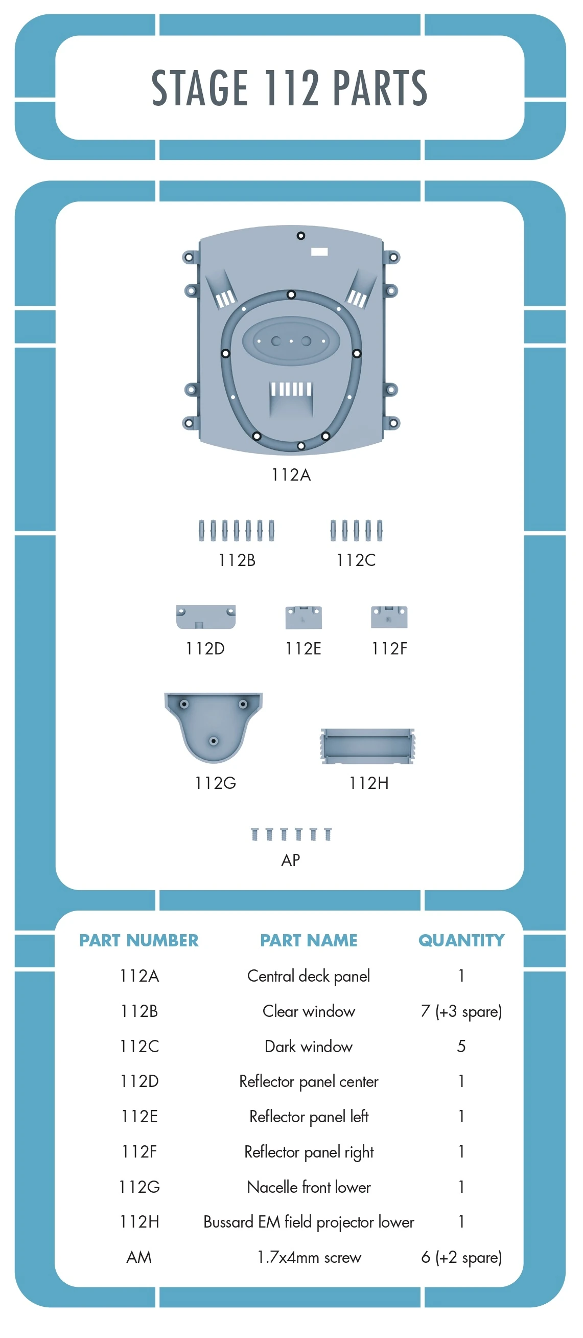 - ↑ The line's senior project manager reported that an opaque replacement for the translucent orange part behind the Bussard collector (from Stage/kit pack 2) would be included with a future issue. [1]