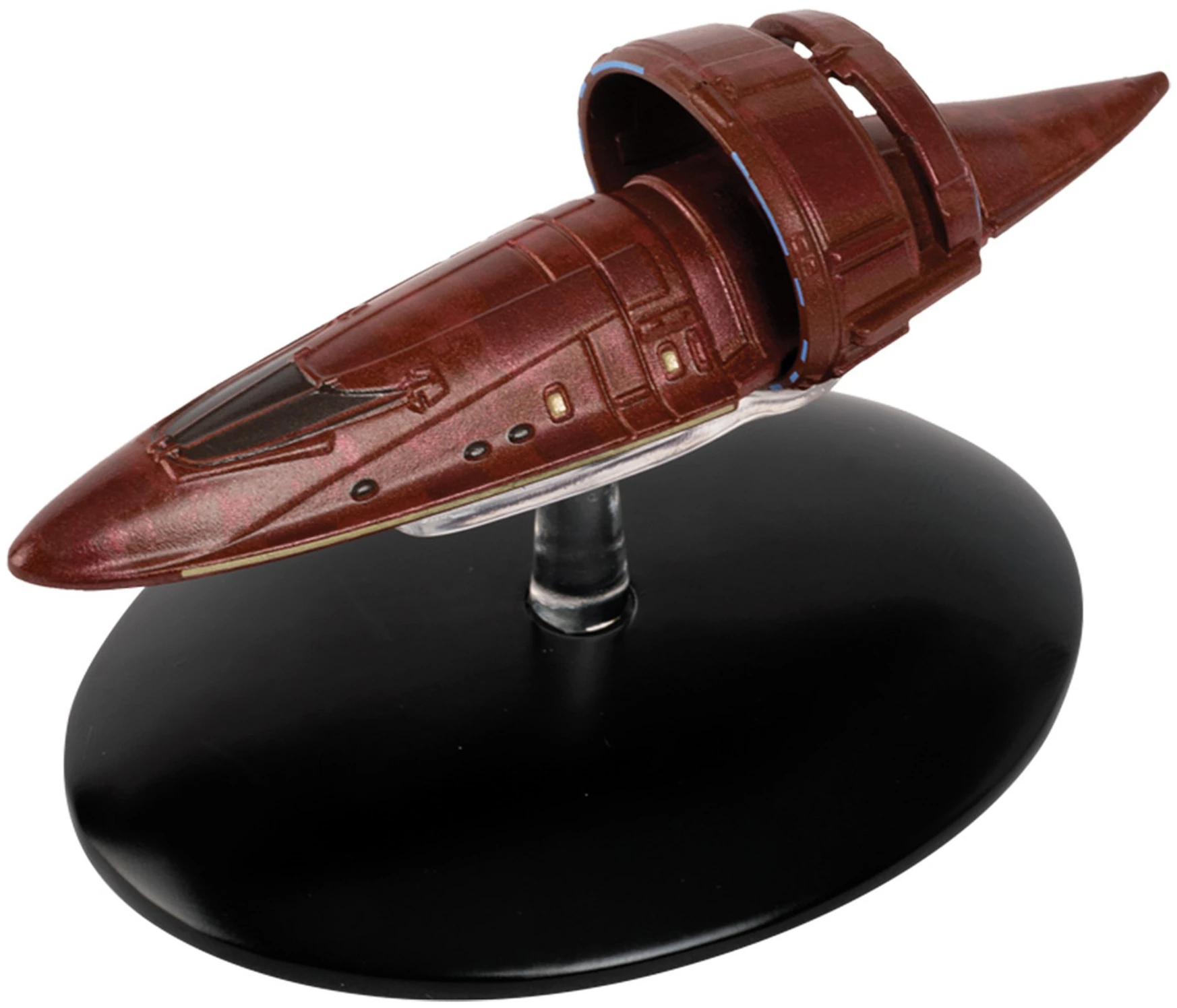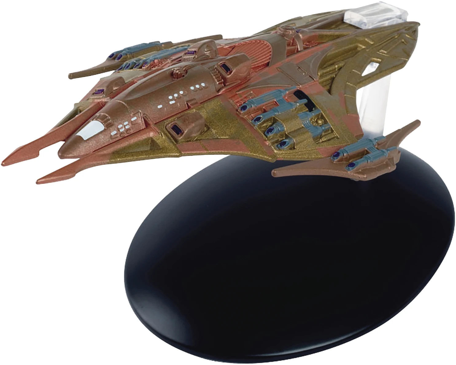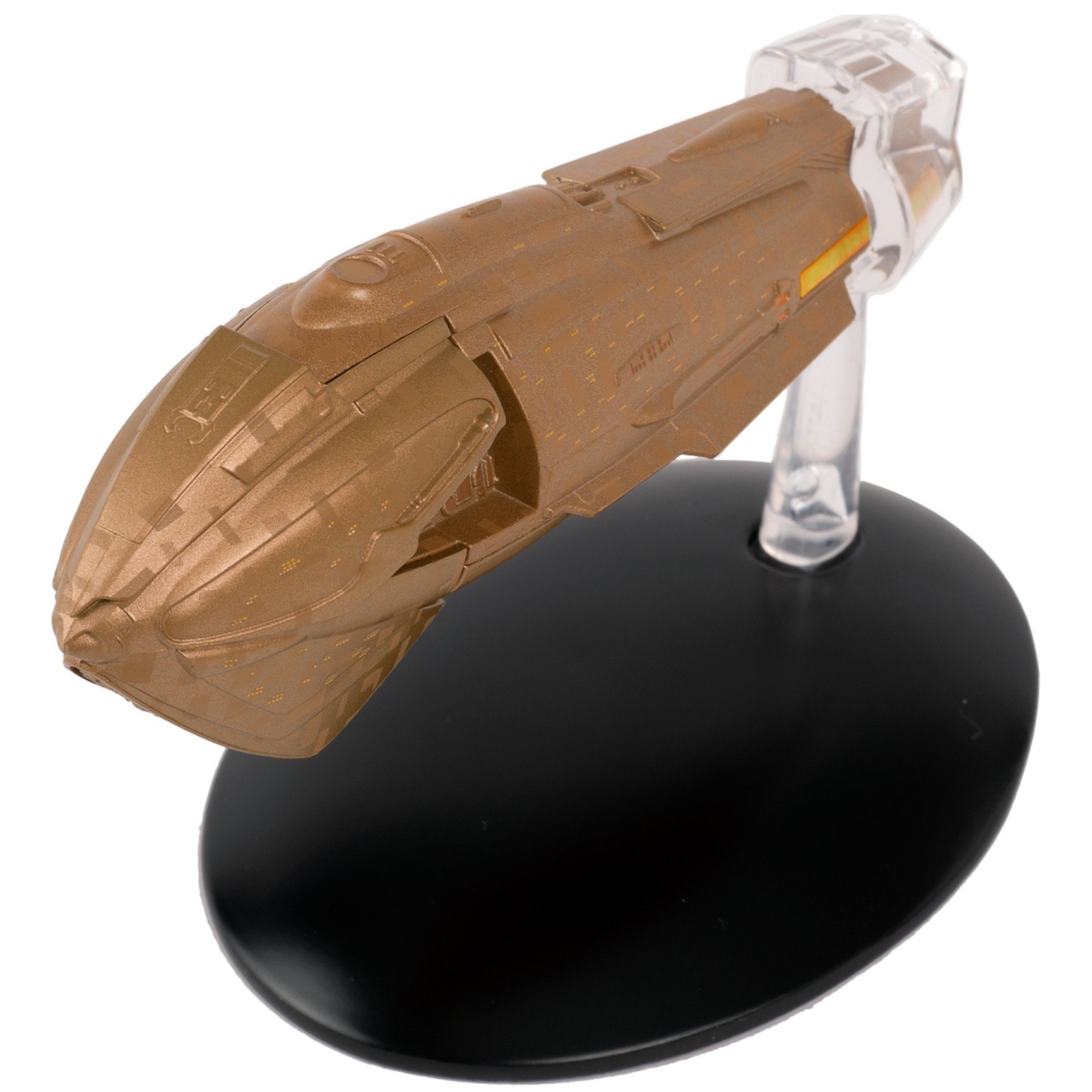 ↑Regular model production had actually just been started up in China when the company went into receivership, but only a handful were manufactured when production was halted. These finished models were eventually released for distribution by the Eaglemoss administrator and sold through eBay in December 2022 by a few Far East and UK dealers for considerable collector prices. These few copies came without the magazine as that issue had not entered the regular print-run yet. [62](X) It therefore has arguably become the rarest of all the to the public released Eaglemoss Star Trek models.
