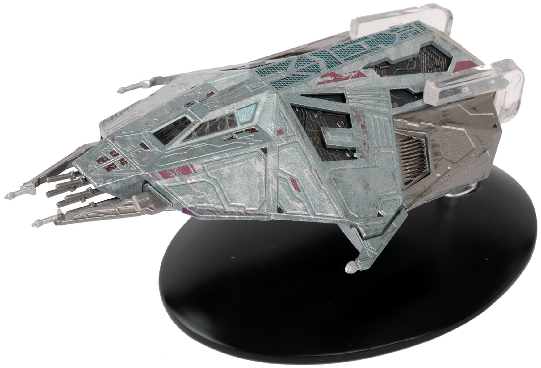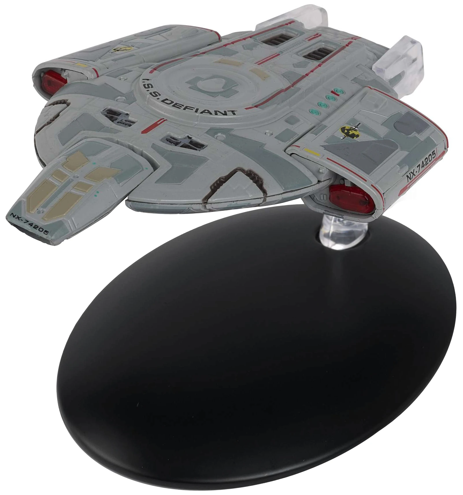 ↑The USS Defiant model features phosphorescent paintwork to simulate the starship's appearance when it became trapped in Interphase. Chronologically, it was the seventh Bonus issue released but it is identified as the tenth in Eaglemoss' catalogs.