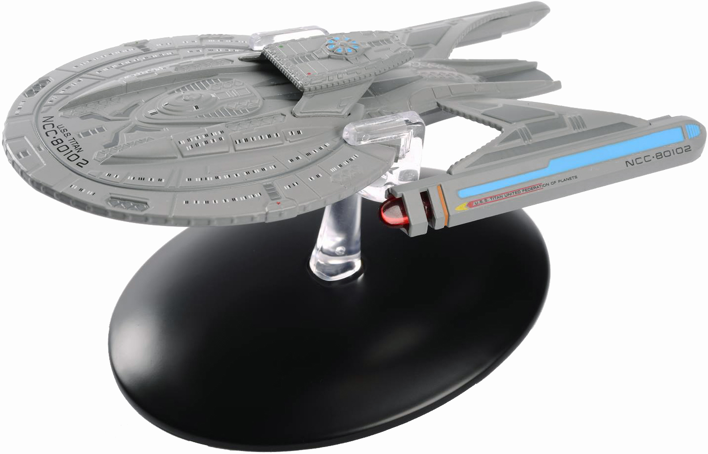 ↑Following a successful online fan petition championed by The Trek Collective and Geekology, [39][40] models of the USS Titan (which primarily appears in Star Trek novels, video games and calendars, but made its first canon appearance in the Star Trek: Lower Decks episode "No Small Parts") were produced. The original CGI model was designed by Sean Tourangeau and constructed by Ellery O'Connell, but the model was modified by Fabio Passaro for this collection.