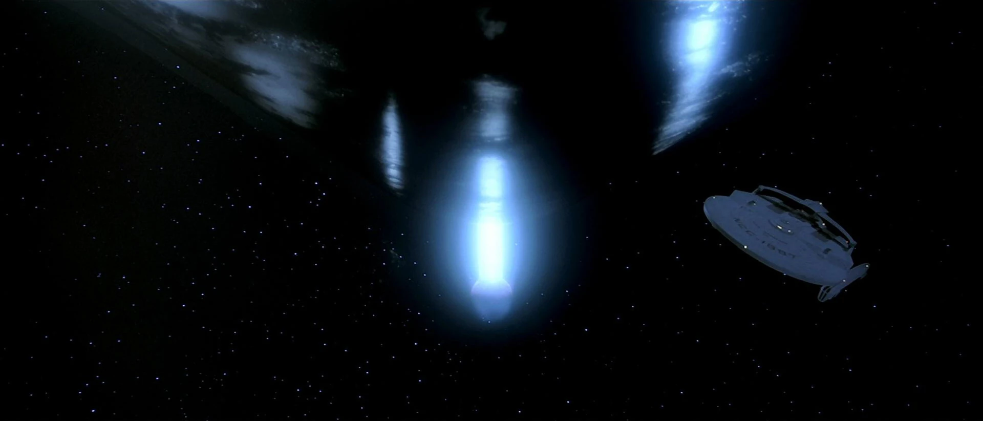 At the same time, the probe has reached Earth and begins the process of neutralizing Spacedock One before they can get the space doors open. All ships inside the dock, including the USS Excelsior, are neutralized and disabled. The probe then continues into Earth orbit and begins pulling water and moisture from the oceans, and clouds begin gathering over the Earth as the probe continues its transmission.