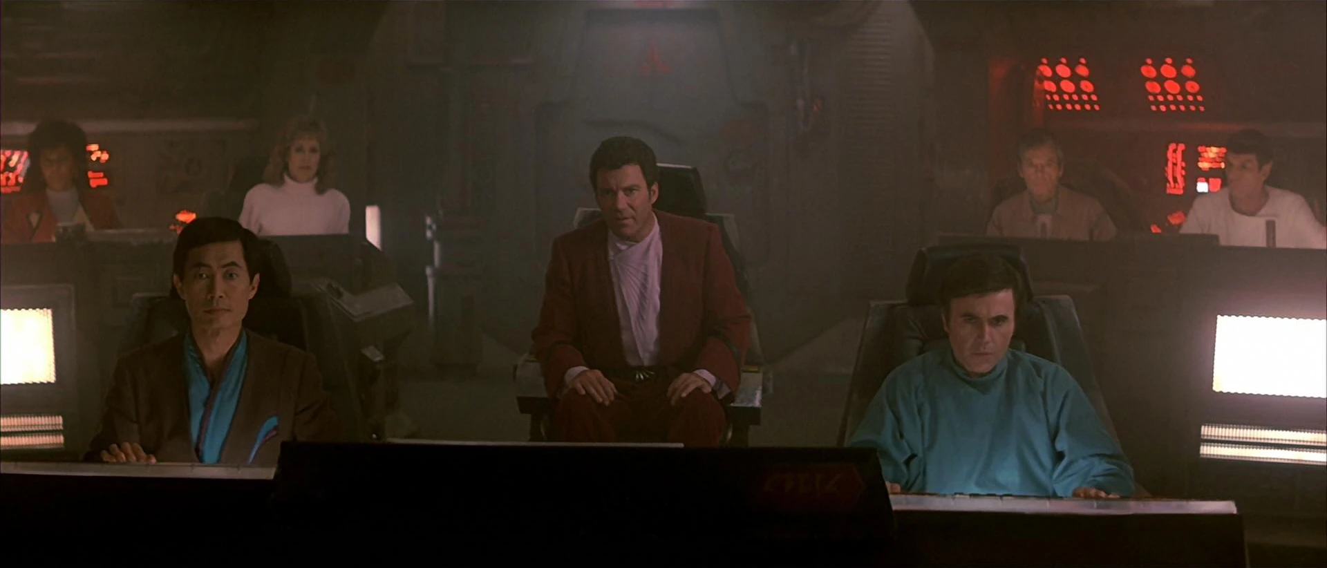 During the final courtroom scene, one shot of the crew filing in has the entire main TOS cast in it: Kirk, Spock, McCoy, Scotty, Uhura, Chekov, and Sulu are entering the room, and Rand and Chapel are visible in the audience behind them. This is the only shot in the entire franchise in which all of these characters are on screen at the same time.