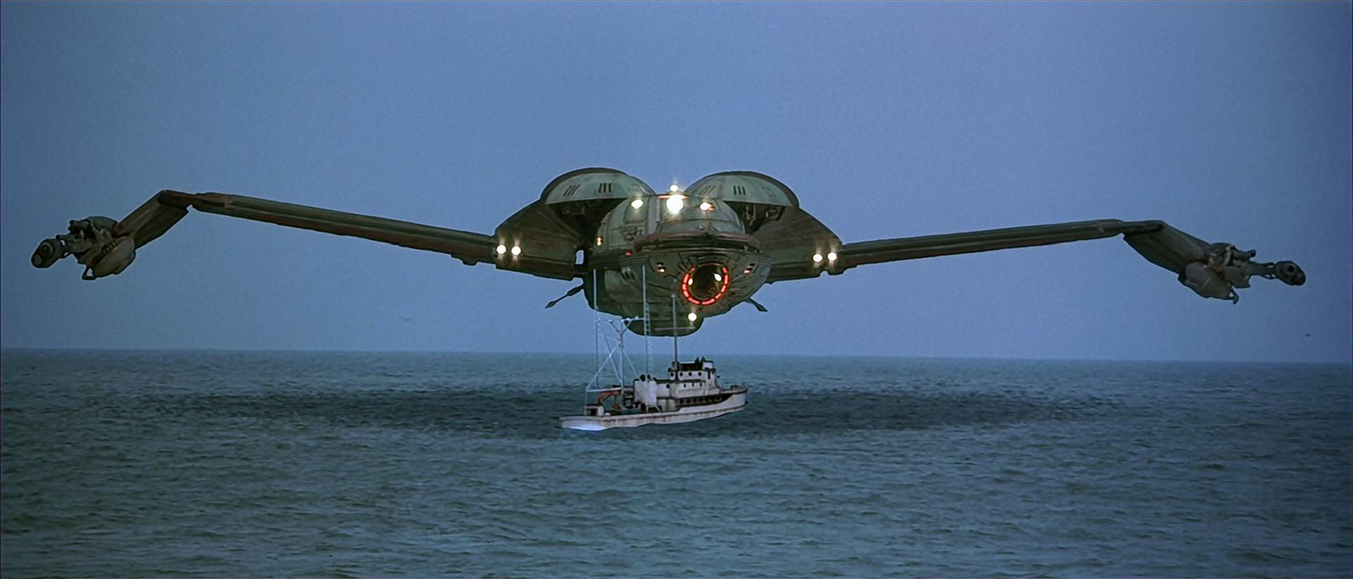 Just then, at the Neutral Zone, the probe comes close to the Saratoga. The captain orders yellow alert, but the probe, issuing a powerful signal, begins draining the ship of all power. As the Saratoga begins to drift, the captain tries to issue a distress call to Starfleet Command.