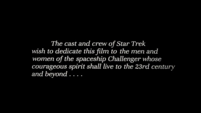 The film is dedicated "to the men and women of the spaceship Challenger", which exploded shortly after liftoff on 28 January1986, almost ten months before the release of Star Trek IV.