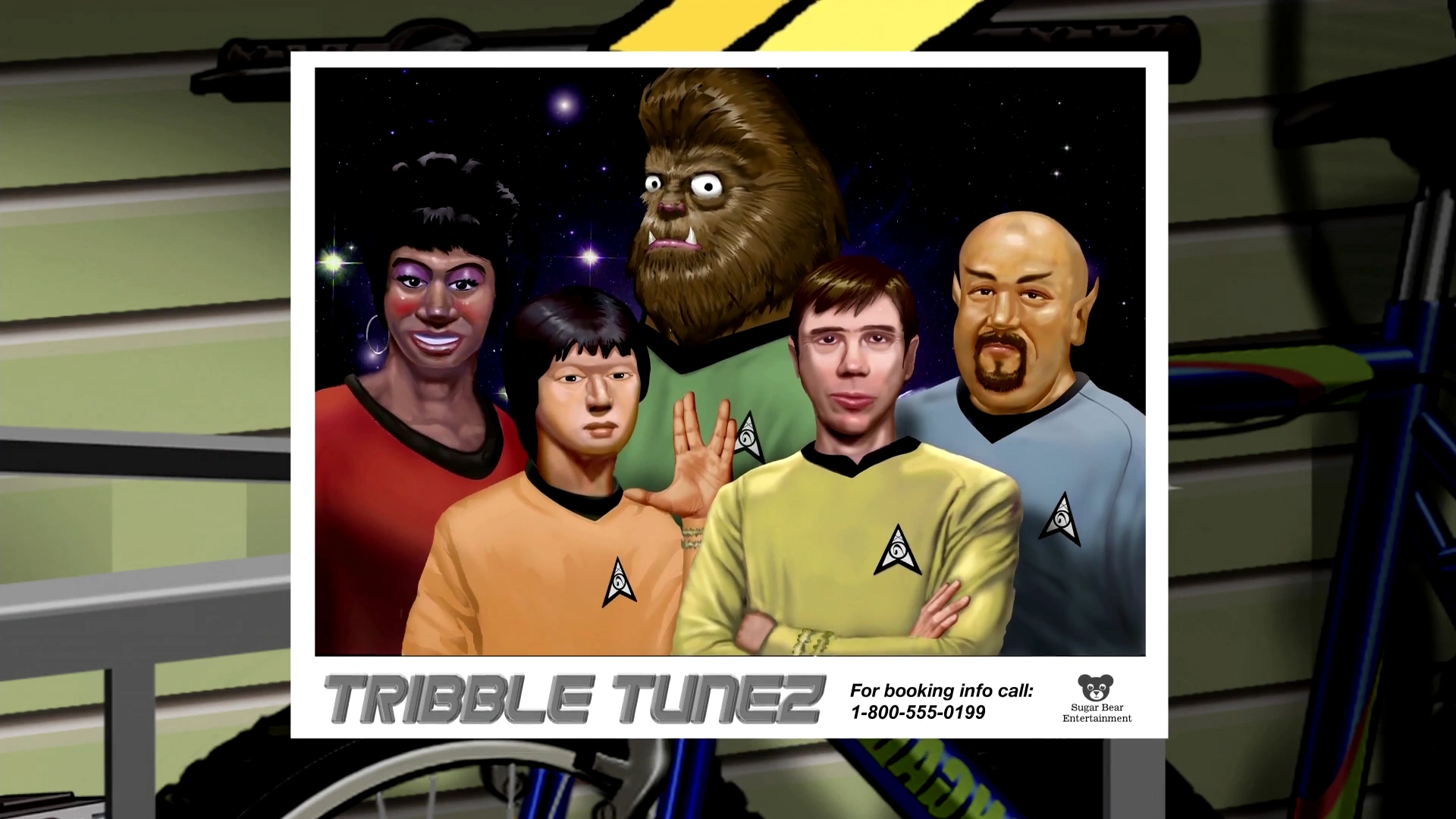 Drewbacca, a shaved Wookie and the episode's antagonist, is revealed by Frylock to be a bass player for a Star Trek tribute band called "Tribble Tunez", and holds up a promotional photo featuring the bandmates dressed in TOS-style Starfleet uniforms. Before that, Drew attempts to pawn a bass amp he used in the band that is furry like a tribble. Drew also signs two cassettes for Master Shake that he plans to sell on eBay, one of which has a Spock drawing, and another a tribble. Finally, as Frylock is ready to kill Drew with a "lightwaver" but is interrupted by the pawn shop clerk, he uses the window of opportunity to request a beam up on a communicator and is teleported away just as Frylock swings at him and misses.