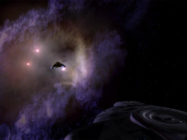 The Rubicon and the Defiant approach a subspace compression anomaly (2374)
