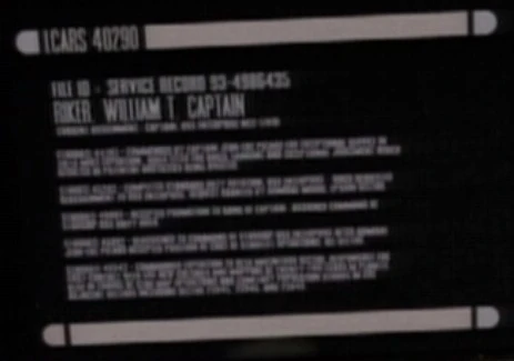 Exactly when and where in TNG: "Conundrum" does Riker's personnel file appear? The only one I know of is this: [1], but nothing can be read, unless people have better eyes than me. Roll on the bluray version--Archer4real (talk) 10:31, July 12, 2013 (UTC)