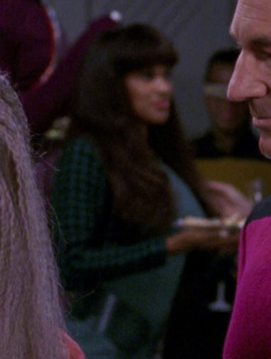 She was also in Ten Forward when Commander Riker and Admiral Erik Pressman visited the bar and when Deanna Troi and Beverly Crusher talked about the events on Caldos. (TNG: "The Pegasus", "Sub Rosa")