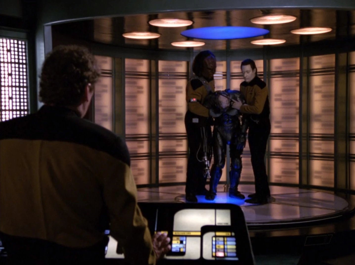 Still in pursuit, the Enterprise receives word from Jupiter Outpost 92 of visual sighting and planetary defenses are responding, but Shelby severely doubts its effectiveness. What's more, the Borg cube is twenty-seven minutes away from Earth and they're forty-two minutes away from the Borg. With such a large gap and little time to waste, Data begins to interface with Locutus. His team consists of Dr. Crusher monitoring Locutus/Picard's medical condition, while O'Brien is doing the equivalent for Data and Counselor Troi is to empathically determine if they are reaching Picard or vice versa, and notes that he doesn't know what to do if there's a problem – this is his first time attempting this. He makes a first connection but fails to get access, nor does Troi sense anything.