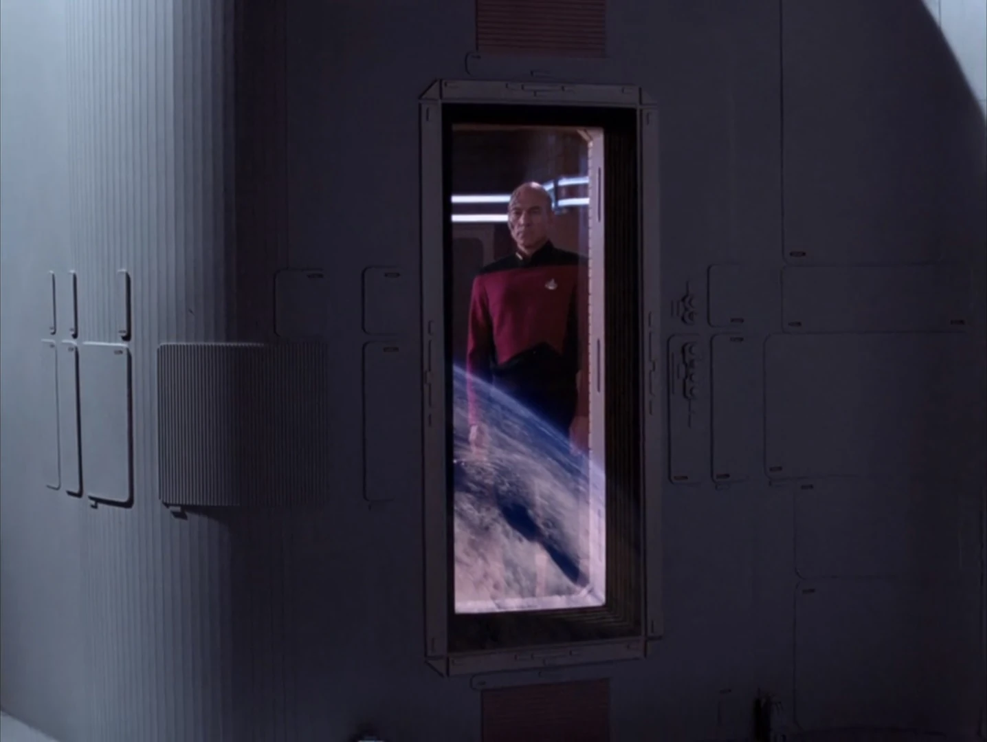 As the Enterprise prepares to dock at Earth Station McKinley for five or six weeks of repair and refit, Picard, with bandages on his head, is back in uniform and at his desk in the ready room. Shelby requests permission from Captain Riker to disembark, and Riker defers to Picard, thus relinquishing command back to him. Picard grants her request and commends her on being promoted to the head of Starfleet's task force in charge of rebuilding the fleet. Shelby is confident to have it back up in less than a year. She also coyly suggests to Riker that he would have his choice of any Starfleet command, but Riker tells her (and Picard) that his career plans are his own business, but he appreciates having options. As Riker leaves to take the Enterprise to Station McKinley and resume his duties as first officer, Picard attempts to return to the PADDs strewn on his desk and his usual cup of Earl Grey tea. But a haunted look plays on his face as puts down the cup. He silently goes over to the ready room's window and looks out at Earth.
