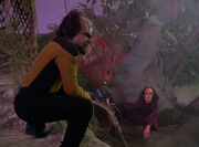 After a particularly vicious argument with Worf, K'Ehleyr storms back to her quarters and shatters a glass table in rage. Counselor Troi notices the destruction and tactfully suggests that she blow off some steam on the holodeck. Seeing the list of available programs, K'Ehleyr selects Worf's calisthenics routine, entering hand-to-hand combat in a primitive jungle.