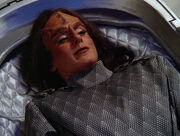K'Ehleyr explains in the conference lounge that a Klingon battle cruiser named the IKS T'Ong was launched from the Klingon homeworld over seventy-five years ago, during the Klingon War, on a long-term mission unknown to the Federation. The crew was placed in cryogenic sleep to travel to their target, and are now on the return. Since the crew of the T'Ong are unaware of the peace between the Federation and the Klingons, they will attack any Federation outpost they see when they awaken.