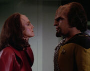 - K'Ehleyr's statement to Worf while leaving the Enterprise at the end of the episode where she says that when their paths cross again, she will not be as easy to get rid of would prove ironic, as in her next appearance in "Reunion", she is murdered by Duras.