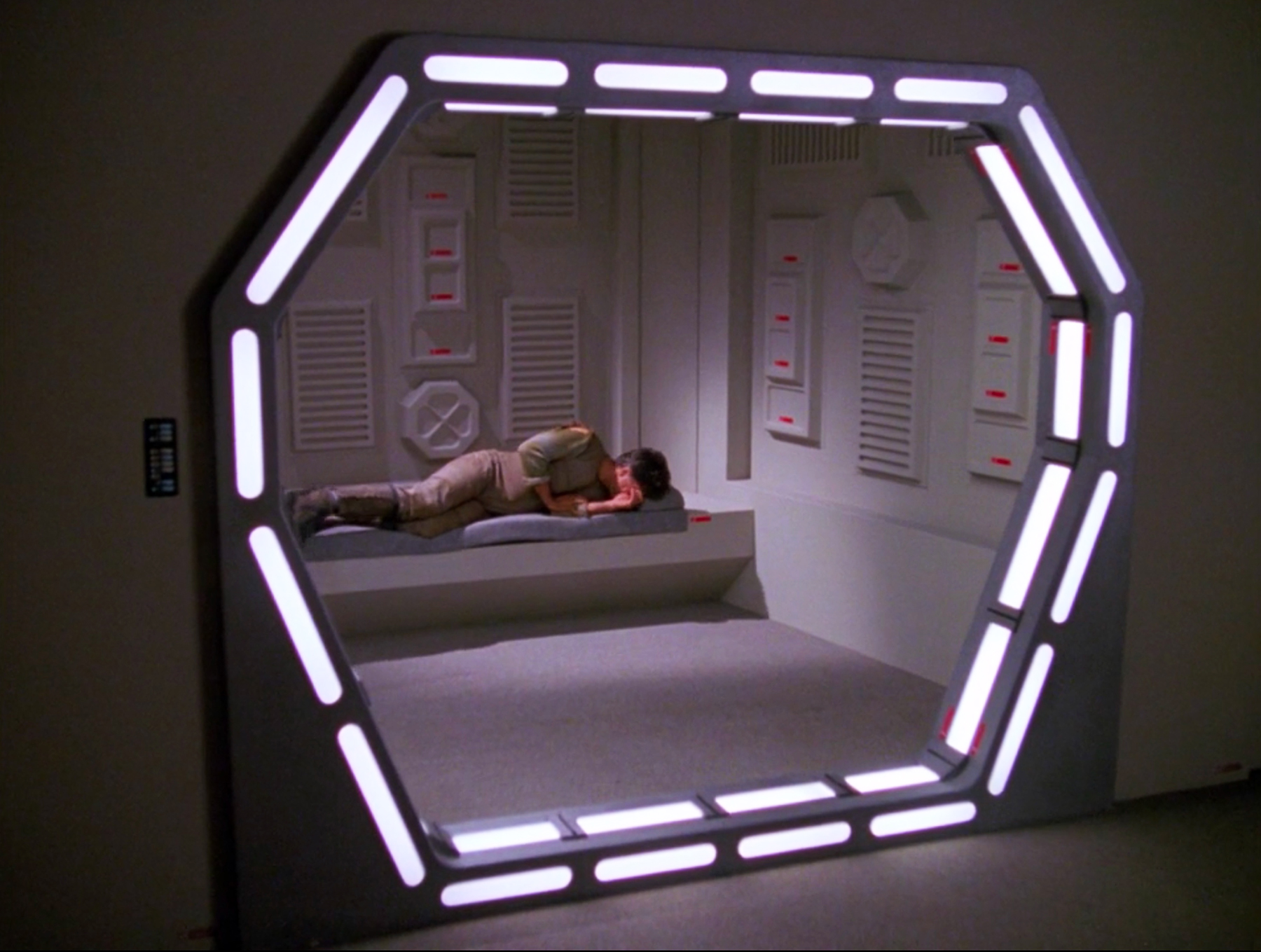In the brig, Danar is tossing and turning on his bunk, apparently in the grip of a violent nightmare. Deanna Troi is passing by the cell in a corridor when she senses his turmoil and goes in to talk to him. Her conversation with the man is a surprise: though he is distrustful and suspicious, he is also intelligent, emotionally perceptive, and even has a fine-tuned sense of humor and irony. She describes her role as ship's counselor and is offended when he labels her a "mind-control expert." She is unable to fathom what has made Danar – for all appearances a civilized man – commit such violent acts and asks if the prisoners on Lunar V are mistreated. Danar replies that, on the contrary, Lunar V is a very comfortable, well-provisioned, and humane prison, but a prison nonetheless, since no one is allowed to leave. Using her empathic abilities, she confirms that the turmoil she sensed while he was asleep is gone, and his inner self mirrors his calm exterior.