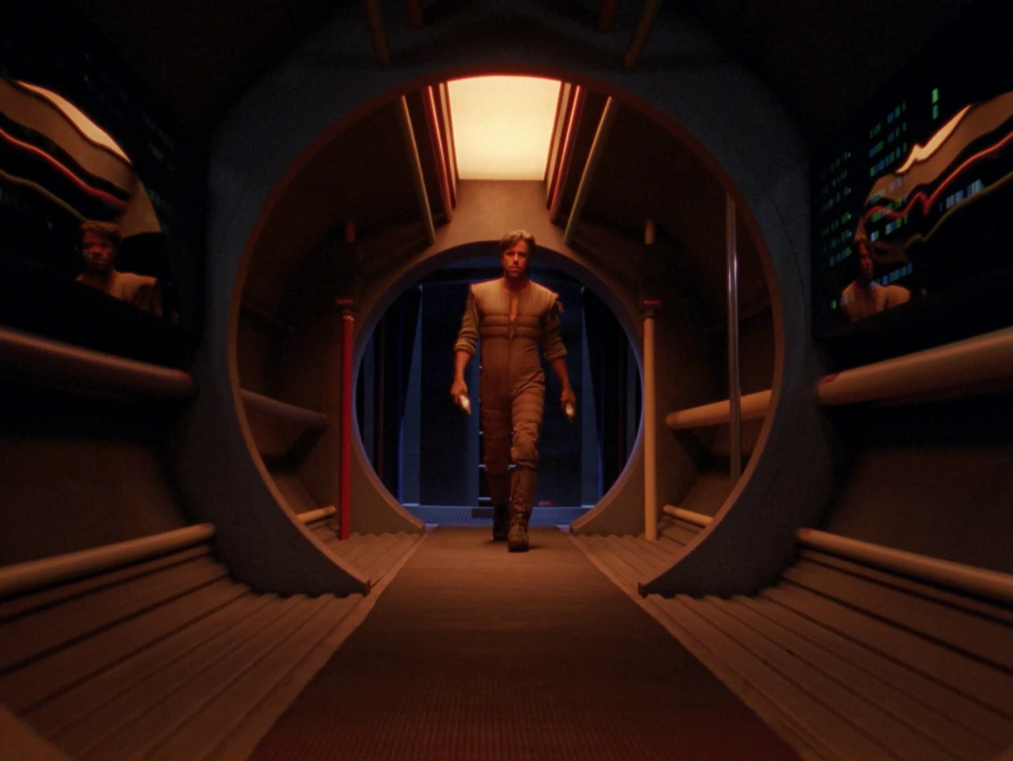 As with the initial pursuit in space, Danar's cunning and resourcefulness are on full display during the chase through the Enterprise's interior. Since the internal sensors cannot track Danar's life signs, they can only follow his movements by activity on the various ship systems he accesses or tampers with. Knowing this, Picard orders General quarters sounded, force fields raised on Decks 34-36, and the power to the transporters and turbolifts shut down.