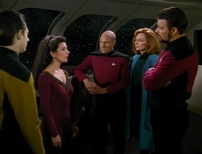Troi tells Picard that she senses something wrong – Danar has a thoughtful and intelligent personality typical of his Angosian heritage, and she does not sense anything inherently violent about him. Picard reminds her of the mayhem he caused while they were trying to capture him and says he will be glad to transfer Danar off the Enterprise when the Angosian shuttle arrives. Troi understands Picard's position and leaves his ready room.