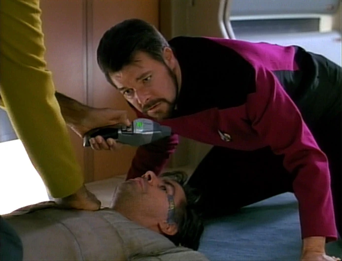 While Picard and Nayrok make the arrangements to send Danar back to Lunar V, Riker asks why the sensors did not detect him. Data has confirmed that the sensors are functioning properly – for some reason, Danar has no discernable life signs. Riker asks the computer to identify the occupant of the brig and the computer informs him that the brig is vacant, even though Riker personally confirmed Danar is currently being held there.