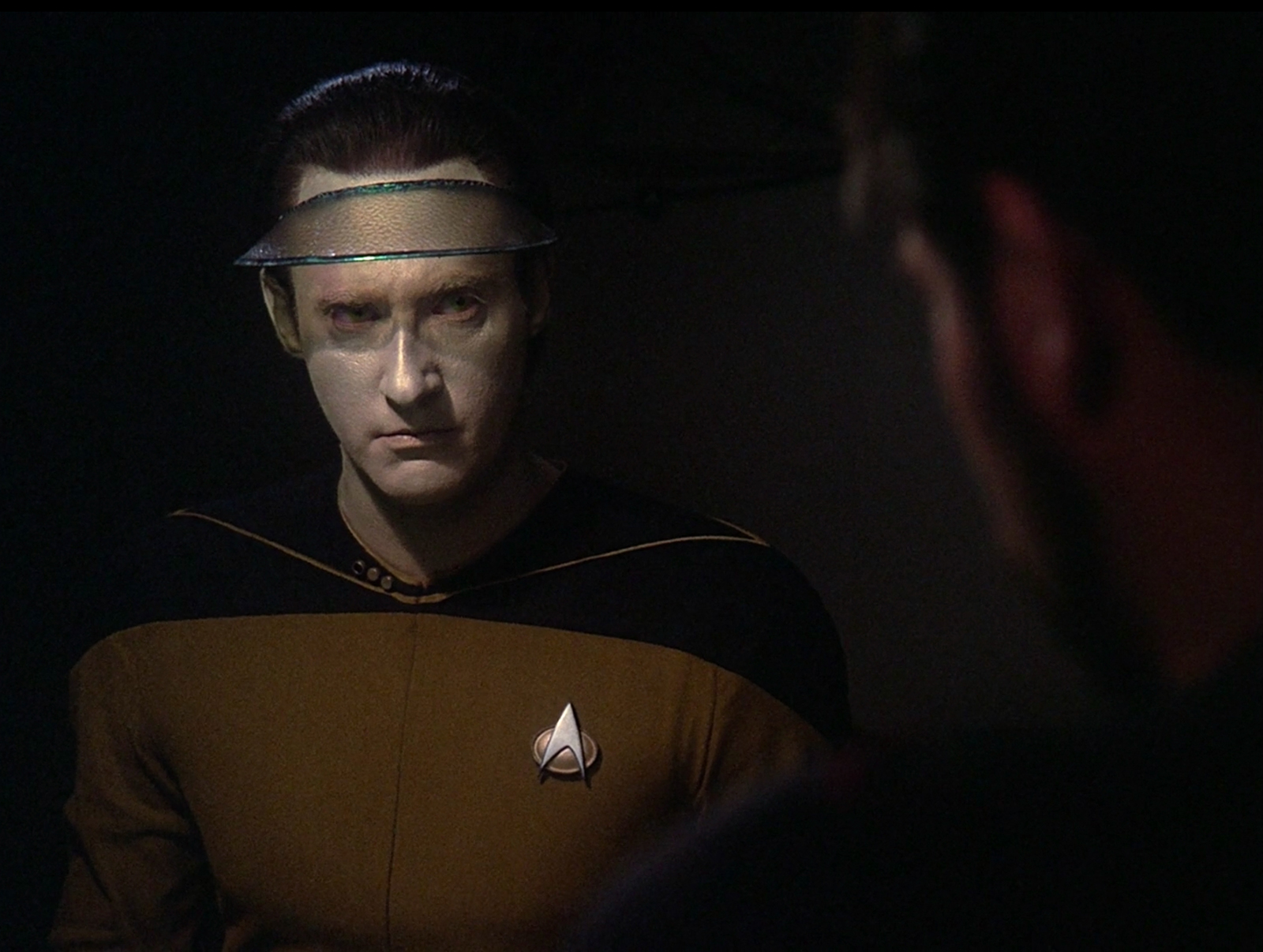 In his ready room, recognizing Starfleet's inherent interests in the creation of more Soong-type androids, Picard attempts to persuade Data into submitting to Maddox's procedure. Despite Picard's approach being the opposite of Maddox's – with the application of much more carrot than stick – Data counters that asking him to submit to an uncertain, dangerous, potentially destructive Starfleet experiment is tantamount to compulsorily requiring all Starfleet officers to have their biological eyes replaced with superior cybernetic implants such as the type utilized by Geordi La Forge. Data goes on to remind Picard that it is precisely because he is not Human – and even considered among some to lack true sentience – that Starfleet is emboldened enough to make their request in the first place. Realizing this to be the jarring truth of the matter, Picard dismisses Data and has the computer pull all relevant information of Starfleet regulations on officer transfers to a PADD for further research, intending to find a way to block Data's transfer.
