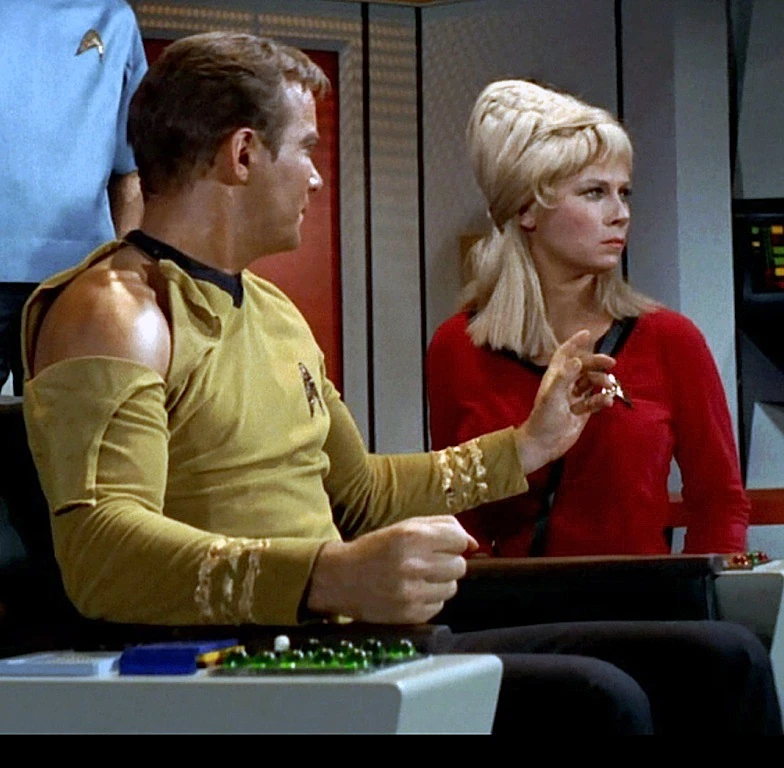 Entering the bridge, Kirk's uniform shirt is ripped by McCoy, who administers the antidote to the captain. Taking the command chair, Kirk's orders are muddled, but a cured Sulu is able to plot the escape from orbit. With a hesitating reach, Kirk longs for his beautiful Yeoman Rand, standing next to him, whom he can't touch but for duty. Spock and Scott finish preparations, and the restart is engaged. The implosion is successful with an unexpected result, sending the Enterprise three days back in time. Perhaps deciding not to return to Psi 2000, Kirk orders a course ahead, warp factor 1.