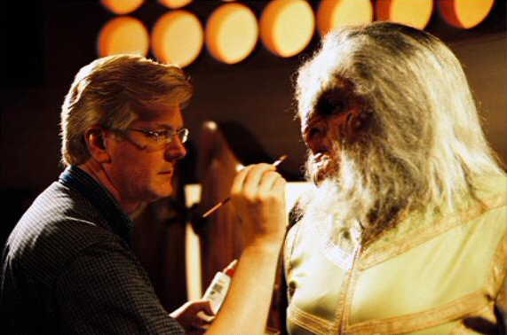 During a break in the filming of this episode, Brad Look tweaks John Cothran, Jr.'s Xindi-Arboreal makeup