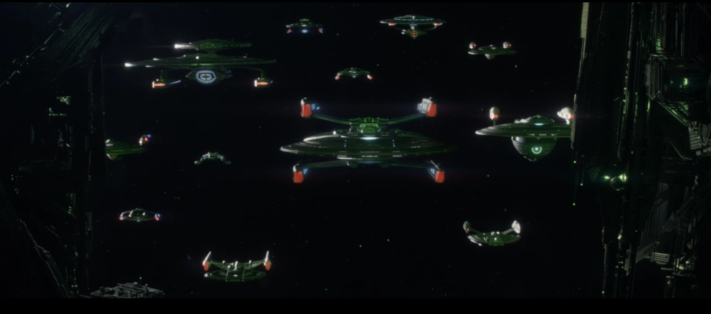 A fleet of ships prepared to face the emerging Borg vessel