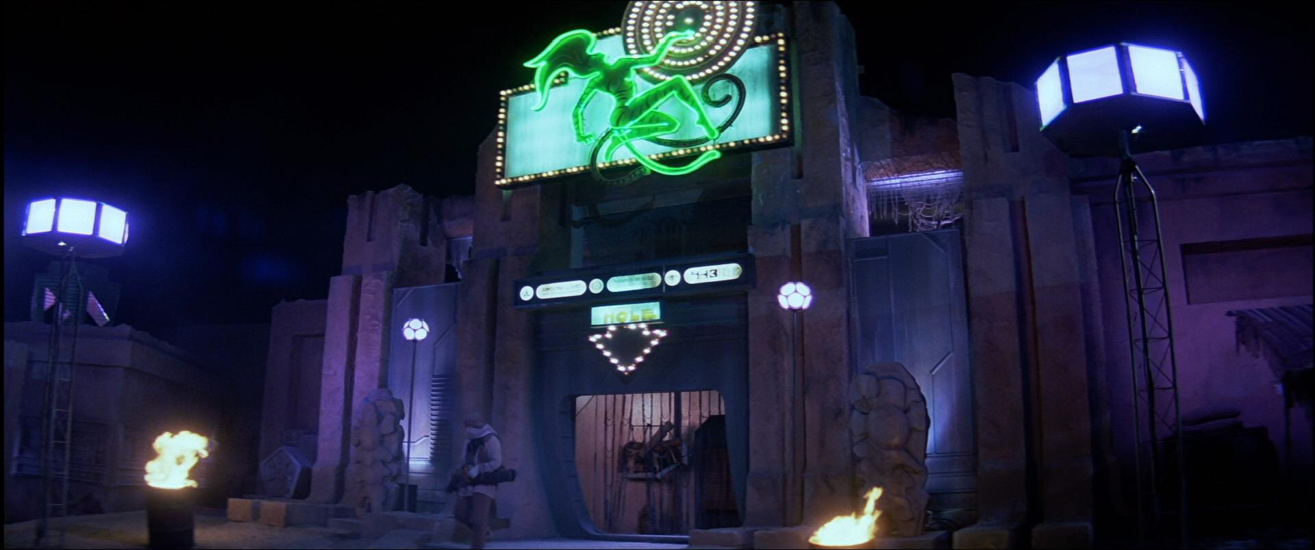 According to the text commentary in the film's Special Edition DVD, "The green neon sign was designed by art director Nilo Rodis-Jamero," and continued to note that "Below the big neon sign are three smaller signs welcoming visitors in Klingon, English, and Romulan."