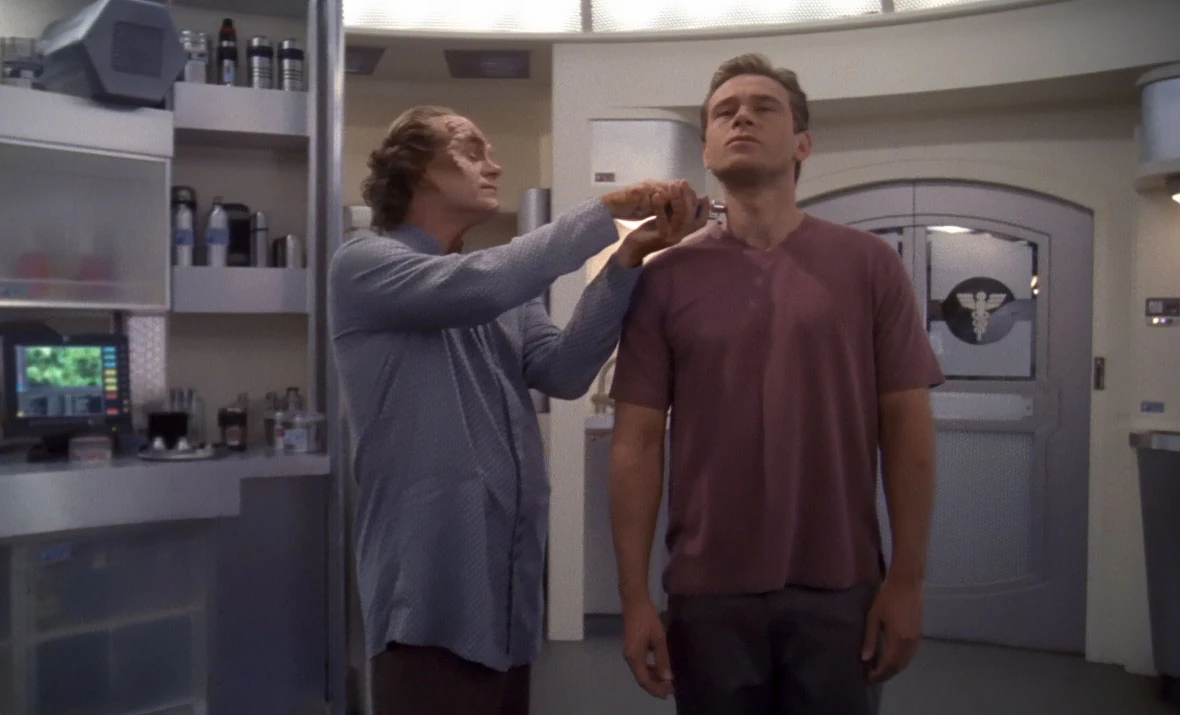 - Scott MacDonald previously appeared as N'Vek (TNG: "Face Of The Enemy"), Tosk (DS9: "Captive Pursuit"), Goran'Agar (DS9: "Hippocratic Oath") and Rollins (VOY: "Caretaker").