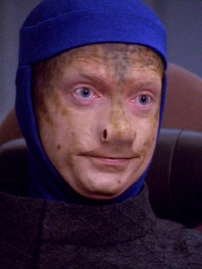 On the viewscreen appears an alien wearing a jacket and a hooded undercoat. He identifies himself as Deputy Consul Burkus of the Monean Maritime Sovereignty. He orders Janeway to withdraw. She responds that she and her crew mean them no harm, explaining that they are explorers and are simply fascinated by their "world ocean," and would like to learn more about it and them. She points out that Voyager could have easily destroyed them all, but has not. Burkus accepts this, noting the impressiveness of Voyager. Janeway smiles and offers him a tour.