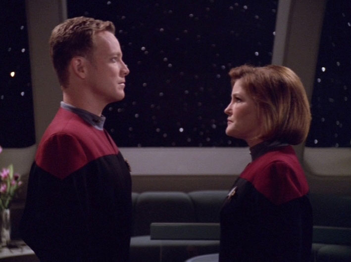 Captain Kathryn Janeway, stands in her ready room aboard the vessel, face to face with her chief conn officer, Lieutenant Tom Paris. Two security officers are present at the door.