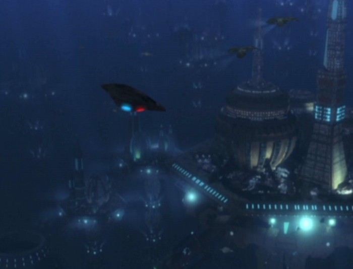 But then a shadow passes. An immense aquatic creature, eel-like, and much larger than the Flyer, appears. It is a predator by the look of its mouth, which is rimmed with dagger-like teeth. Like the Earth fish known as the electric eel, it discharges large amounts of electricity that begin shorting out systems on the Flyer. Riga has no idea what it is; not having been at these depths before, his people have no idea what lurks down here. Seven, however, uses a few shots from the shuttle's phasers to convince the creature to find easier prey.