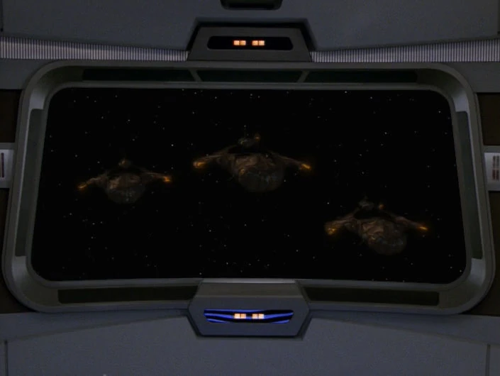 Phlox hails and quickly informs The Doctor of the change in attack plan, the three Hierarchy ships arrive and de-cloak. Phlox' superior hails Voyager as Phlox said would happen. Chakotay orders an on-screen answer. The superior appears and tersely informs Voyager of their intent to raid them. Janeway prompts The Doctor with a response but in his nervousness, he makes a mistake, though he immediately corrects it. As the superior threatens them, Tuvok cuts the communication long enough to inform Chakotay that he has found a potential weakness in the attackers' shields. Chakotay moves to the tactical station to see it and orders the communication reestablished.