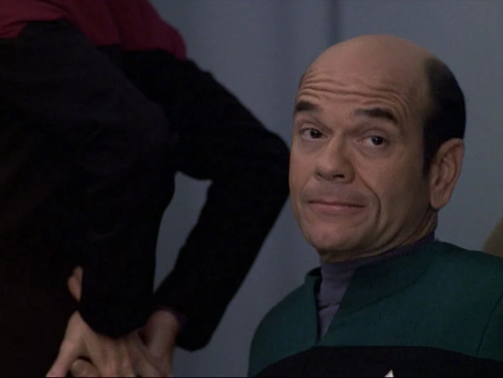 - This episode shows Robert Picardo wearing the red command division uniform. This places him among the few regular actors who have worn all three colors, as he regularly wears the teal sciences uniform and, in VOY: "The Swarm", he wore the gold operations uniform as the Alpha 11 Diagnostic program. He also wore yellow while playing the real Lewis Zimmerman in DS9's "Doctor Bashir, I Presume".