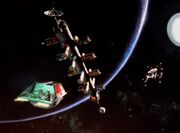 If Astra ever had shot footage of the model, none of it was used, due to the visual effects debacle in late February 1979, after which RA&A and its subsidiary were released from the movie on 22 February. The travel pod studio model was subsequently handed over and (re-)shot for The Motion Picture on one of Trumbull's stages at Future General Corporation (FGC). (The Making of Star Trek: The Motion Picture, p. 206) Preparing the travel pod model for re-filming involved Photographic Effects Cameramen Hoyt Yeatman and Alan Harding. (The Making of Star Trek: The Motion Picture, interior color photograph section) Though the long shots of the pod were taken with footage of the model with figurines in it, there were shots in which live footage of the actors were composited into footage of the model, or as Trumbull has stated,"The live-action footage was shot in a stage against a black velvet and then rear-projected into the travel pod. The model, which was a couple feet long, had a hatch in the rear that was removable; so for the scenes where you see Kirk and Scotty inside. The rear hatch was taken out and the pod was mounted along with a rear projection unit on a rig which allowed both of them to travel down a track together. So what you're seeing is a rear-projected image through the window." (Cinefex, issue 1, p. 15)