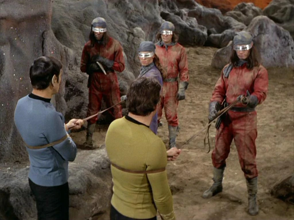 A group of Troglytes capture Captain Kirk and Commander Spock.