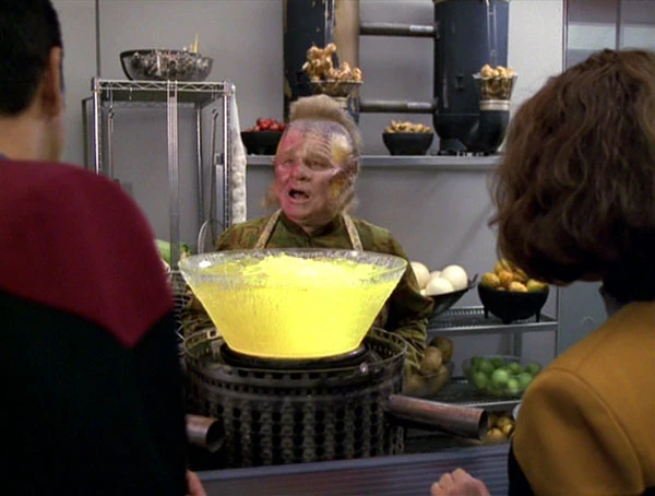 As Chakotay continues along the corridor, he encounters Chief Engineer B'Elanna Torres. They discuss an upcoming match of the type they saw earlier. Heading into the mess hall, they are horrified to see Neelix cooking a most unappetizing-looking bright yellow gel. They fervently hope that it is not going to be served as lunch. Neelix turns to face them, half of his face severely sunburned, and painfully explains that it is leola root skin ointment to treat the burns. In his excitement to visit one of Norcadia Prime's exquisite beaches, he forgot to take an injection of dermaline, a drug to prevent sunburn, and, unfortunately, fell asleep under the planet's twin suns. The two officers sympathize with him, but Neelix prefers not to have them bring down their spirits by feeling sorry for him, so he turns their attention to how they are spending their shore leave.