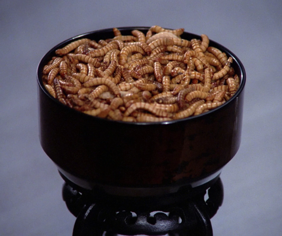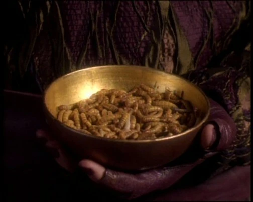 Tube grubs resembled the food eaten by Starfleet Command personnel while under the control of the parasitic beings in TNG: "Conspiracy", because both props used mealworms.