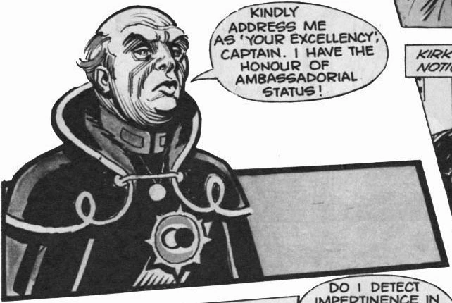 Captain Kirk and Mr. Spock make an inspection of officers en route to the transporter room in preparation for the arrival of Ambassador Courtenay Marshall of the Federation Council. The ambassador beams aboard with perfect timing, and suggests that Kirk respectfully refer to him as "Excellency". He informs Kirk that he will be using the captain's quarters and requires a station prepared for him on the bridge. Kirk points out that having civilians on the bridge is prohibited under eighteen Federation regulations, and Marshall angrily retorts that Kirk is to obey his orders without question. Countering, Kirk asks for orders in writing, which Marshall grudgingly produces.