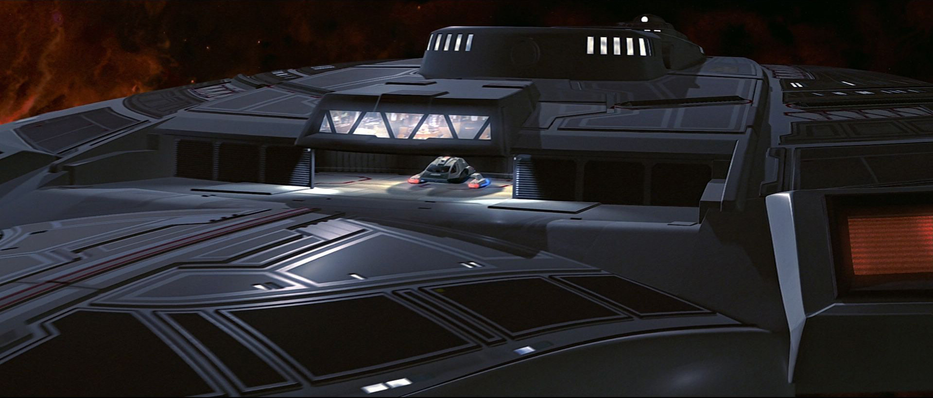 The Nemesis CGI model included several modifications designed by John Eaves. In addition to the new weapons mentioned above, the warp pylons were slightly modified and the connection between the primary and secondary hulls near the main shuttlebay was made more sleek.