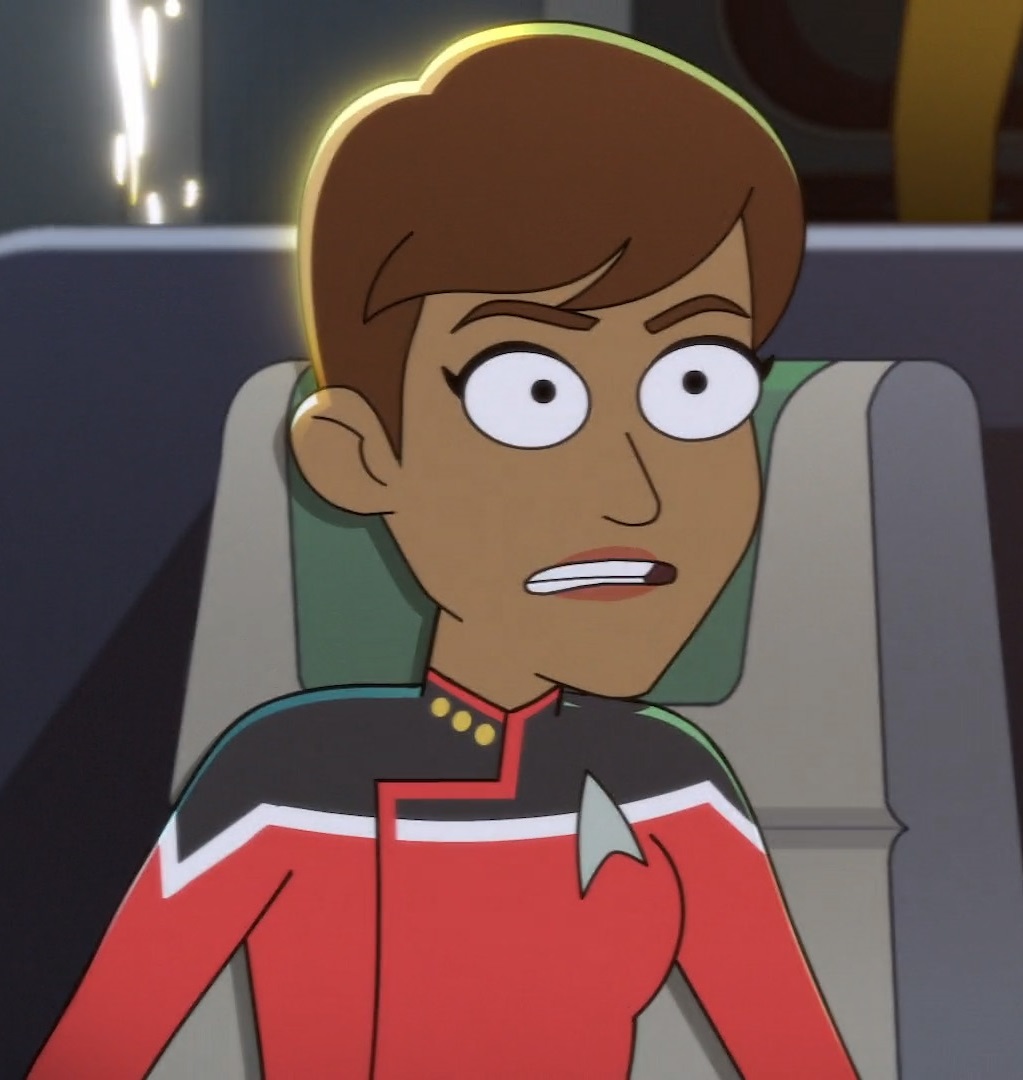 Aboard the Rubidoux in 2380, she was rescued from the Rubidoux's bridge after the ship had been taken over by a space entity and was then beamed to the USS Cerritos. Due to the nature of his transport, she suffered from being slightly out of phase for a short time. (LD: "Much Ado About Boimler")