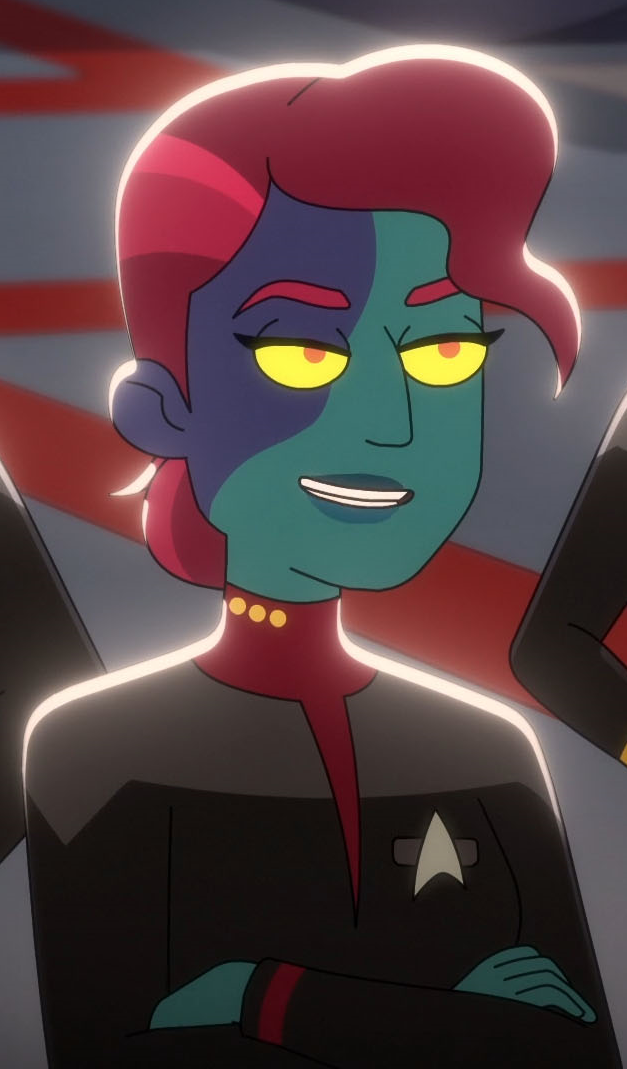 She joined up with a male command lieutenant and Lieutenant jg Brad Boimler at Boimler's quarters before his and her bridge shift. She was impressed with Boimler's knowledge of Tulgana IV. She later sat next to Boimler at the second conn position on the bridge as the ship set course for the planet. (LD: "No Small Parts")