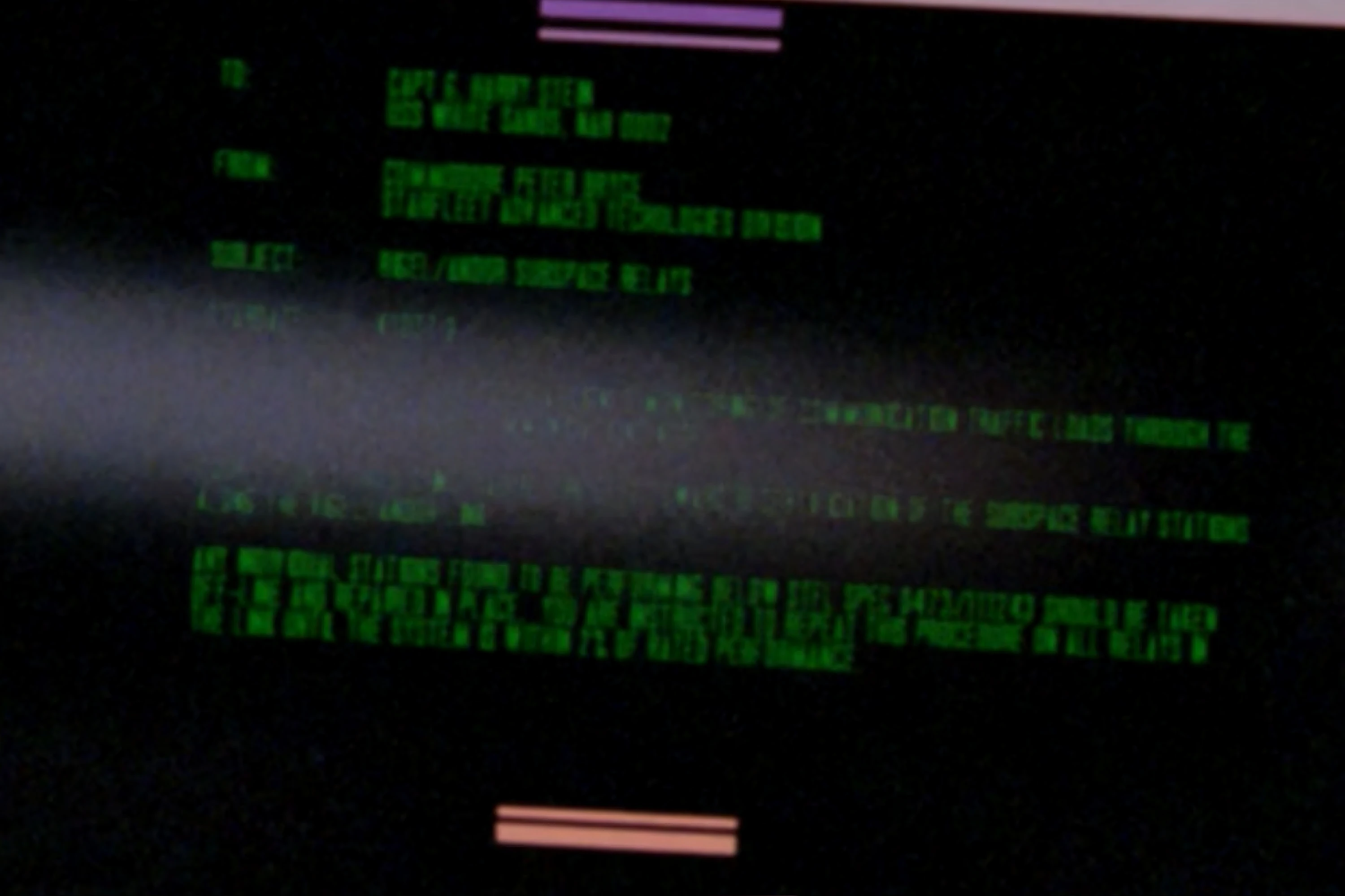 The orders concerned the subspace relay stations along the Rigel/Andor line. Any stations found to be performing below STFL spec 0473/111243 should be taken off-line and repaired in place. Captain Stein was instructed to repeat this procedure on all relays in the lane until the system was within 7% of rated performance.