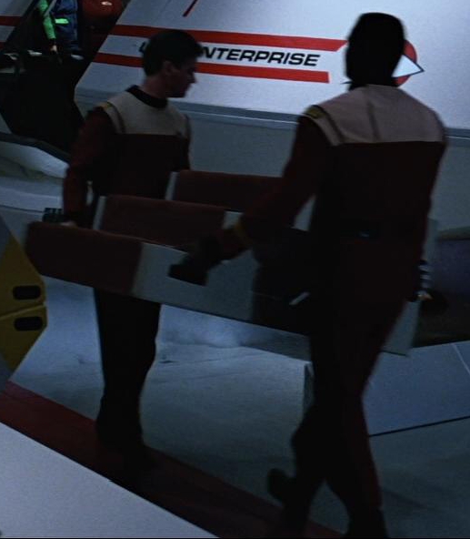 These two crewmembers carried a ramp to the shuttlebay, when the shuttle Galileo landed on board, with Captain Kirk, Spock, Doctor McCoy, and Commander Uhura returning from Yosemite National Park in 2287. (Star Trek V: The Final Frontier)