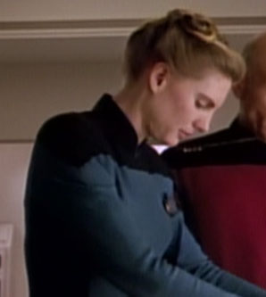 This science division officer had a drink at the bar in Ten Forward when Q discussed with Data and met Guinan. She suspiciously eyed Q. (TNG: "Deja Q")