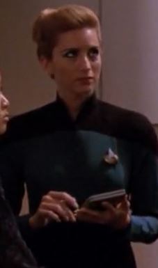 She had a drink with Crewman Nelson in Ten Forward when the empathic metamorph Kamala flirted with Worf (TNG: "The Perfect Mate") and was off duty in the bar when the ship explored the FGC-47 nebula (TNG: "Imaginary Friend") and while the Borg drone Hugh was held in the detention cell. (TNG: "I Borg")