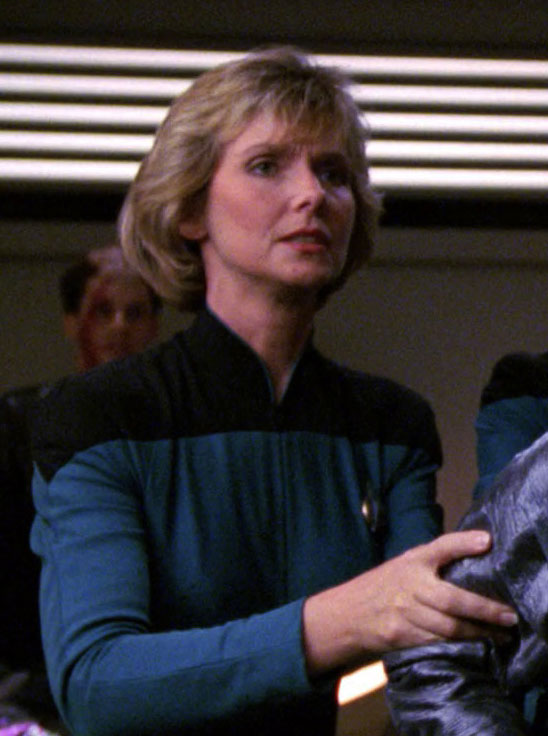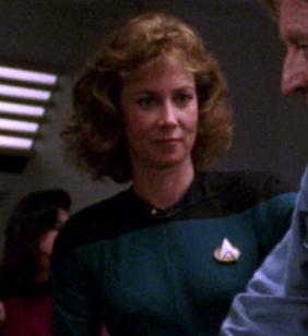 She was on duty in sickbay when Dr. Crusher treated her bruises from the bat'leth training with Worf. (TNG: "The Quality of Life")