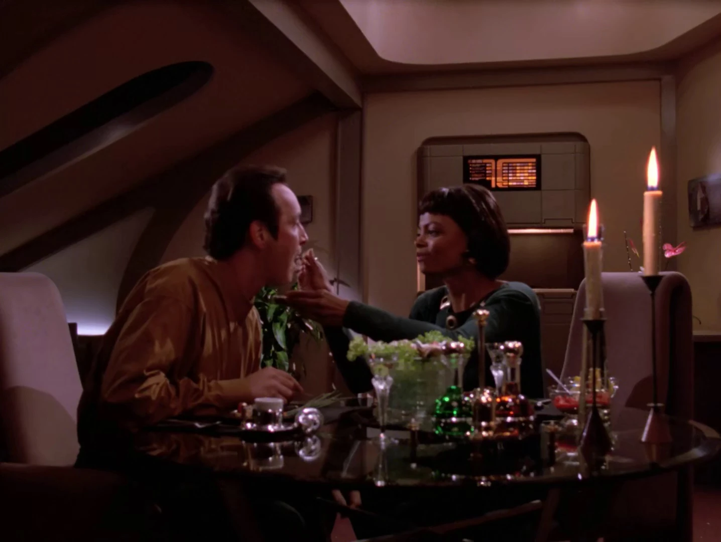 She had a date with a man in Ten Forward when Commander Riker and the J'naii Soren had split pea soup for lunch. Soren was observing the couple and asked Commander Riker about the Human sexuality. (TNG: "The Outcast")