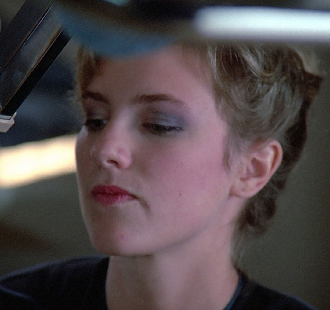 She was on duty in sickbay when Deanna Troi was held in a stasis field due to her strange behavior and her attack on Captain Picard. (TNG: "Man Of The People")